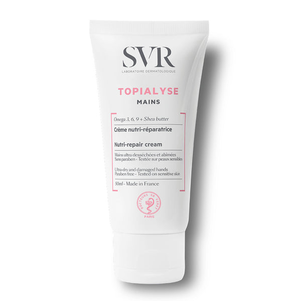 This SVR TOPIALYSE Nourishing Hand Cream is formulated to intensively restore lipids for extremely dry, damaged hands. It soothes, repairs, and relieves skin that is prone to flaking, offering a pleasant, non-greasy finish that absorbs effectively.