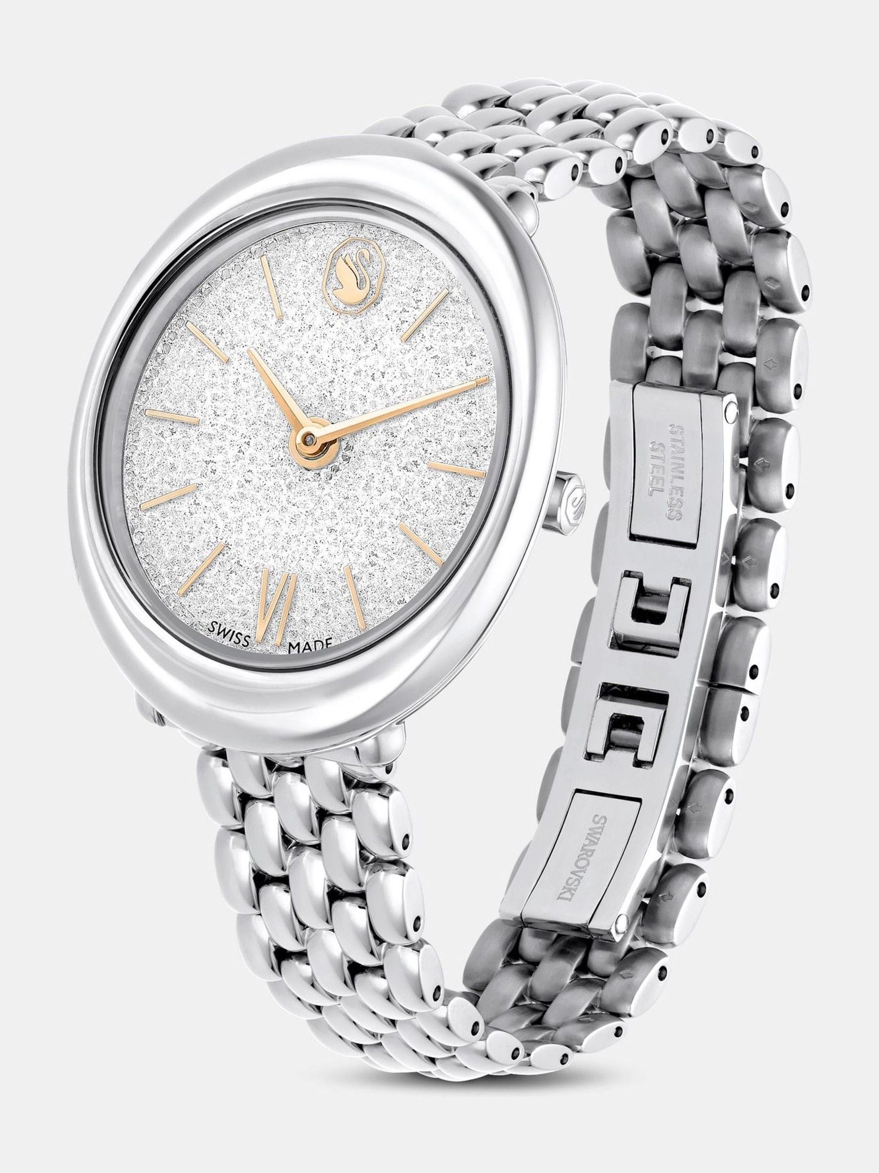 The Imber Oval timepiece conveys a modern approach to watchmaking through its glittering dial and timeless elliptical shape. This 24 x 26.3 mm version is crafted in stainless steel and features around 1000 clear crystals on its Crystalline dial.