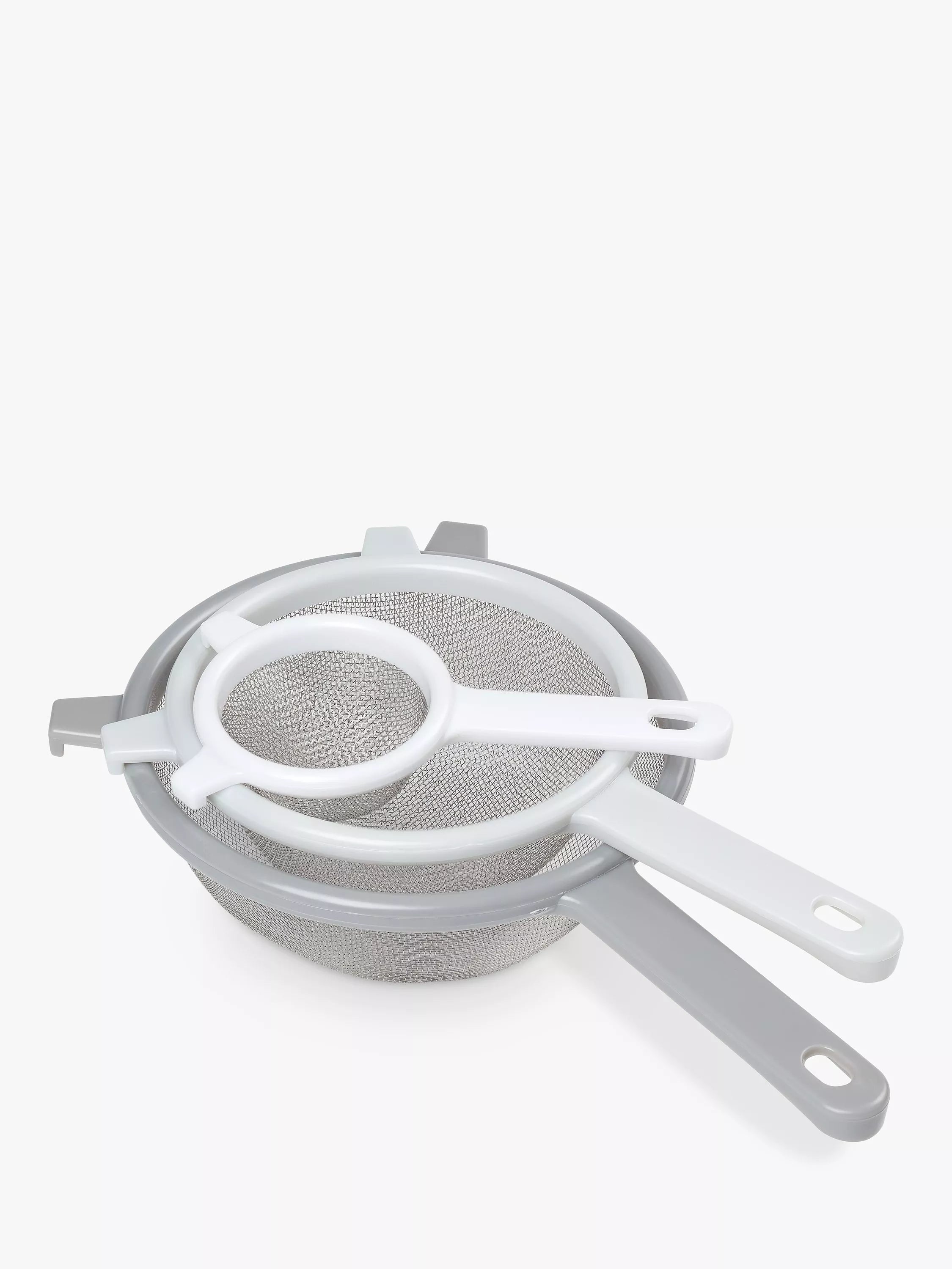 Ideal for sifting flour, icing sugar and cocoa power, these three sieves are made of plastic with a robust stainless steel mesh. Use the hooks to secure the sieve over the edge of a cup or container when straining liquids. The set includes three different diameter sizes: 8cm, 15cm and 18cm.