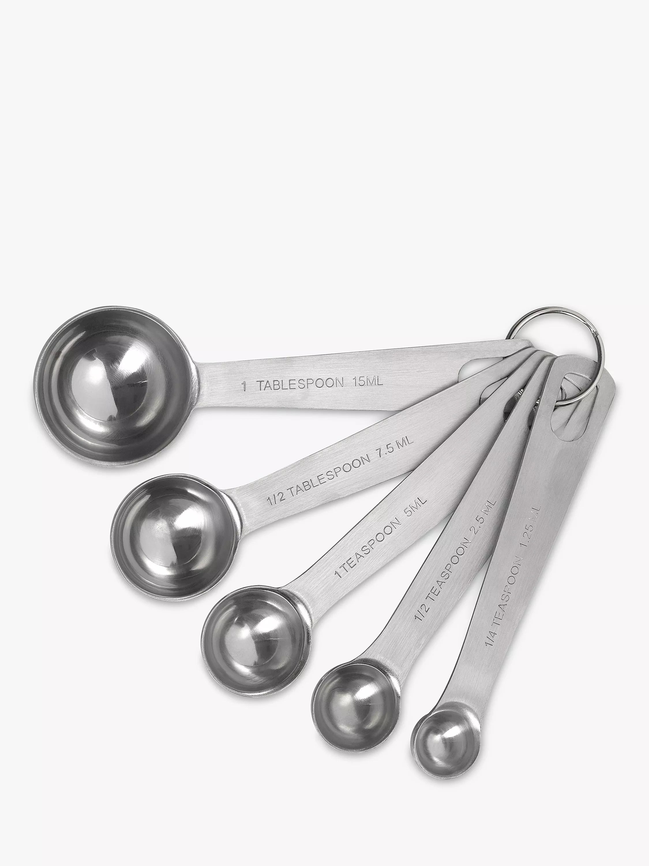 Five stainless steel measuring spoons from Tala, for precision baking and cooking. They nest together for compact storage in a kitchen drawer and are held together on a ring. Dishwasher-safe for easy cleaning, they have imperial and metric measurements on the handles.