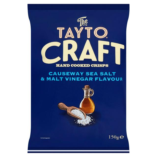 Discover the rich, layered flavour of Tayto Craft crisps, expertly prepared using a traditional method. These substantial 150g bags showcase the premium "Hand Cooked" preparation that gives them their superior texture. The sophisticated Causeway Sea Salt and Malt Vinegar profile offers a sharp yet balanced savoury experience.