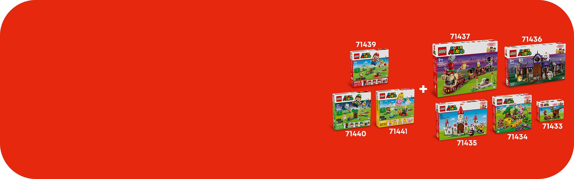 Add a LEGO® Mario™, LEGO® Luigi™ or LEGO® Peach™ figure (not included) for interactive play. Help them to chase the train in the handcar, operate the spinning platform on the locomotive and activate the cannon wagon’s spring-loaded shooter. Once all the enemies are defeated, trigger horn sounds as they drive Bowser’s Express to the station.