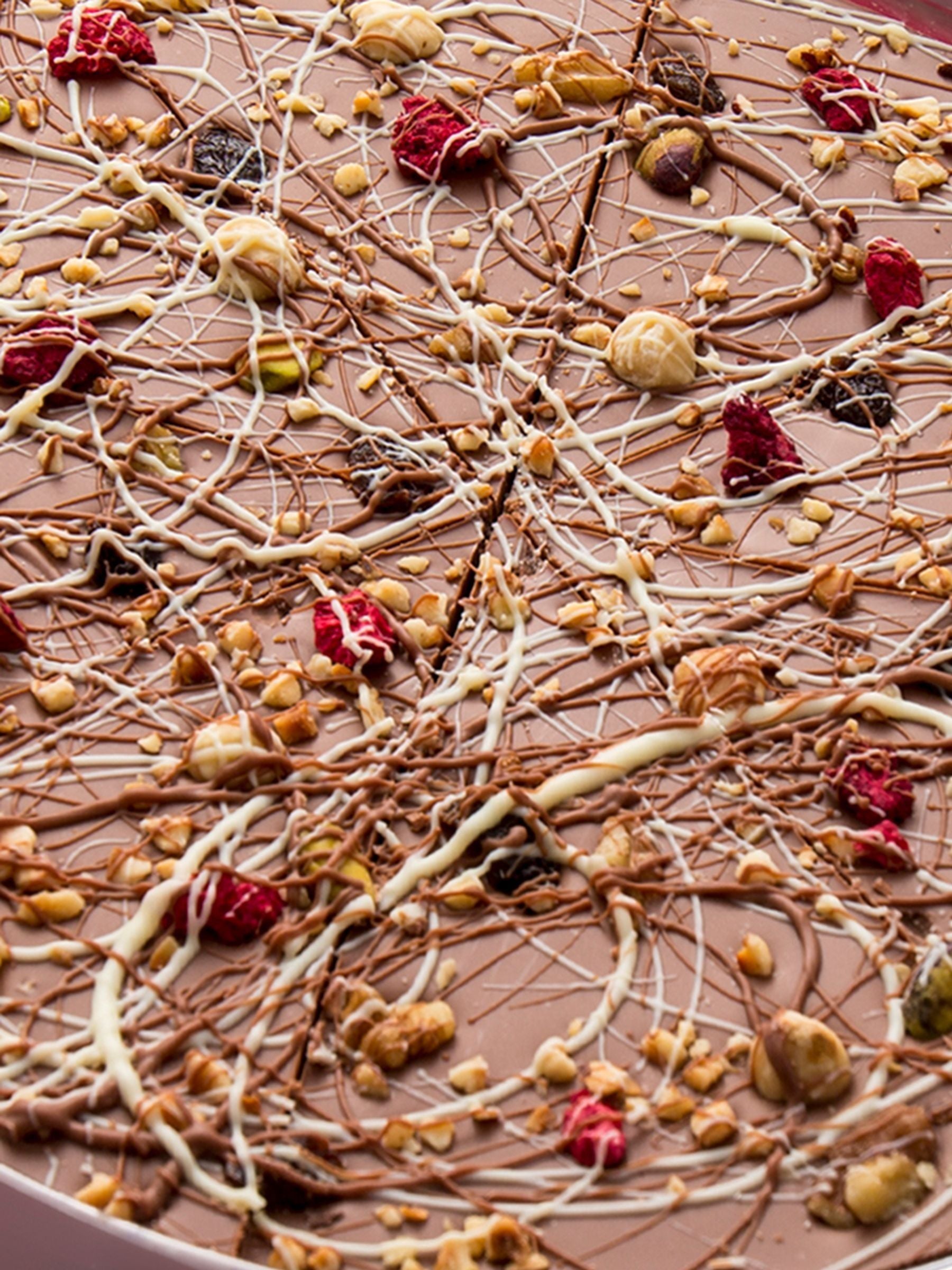 If you love fruit and nut chocolate you will love this chocolate pizza. Smooth Belgian milk chocolate, with a delicious selection of freeze dried raspberries, raisins, whole and diced roasted hazelnuts all generously sprinkled over the top then drizzled with milk and white chocolate. Cut into 8 slices and ready to enjoy.