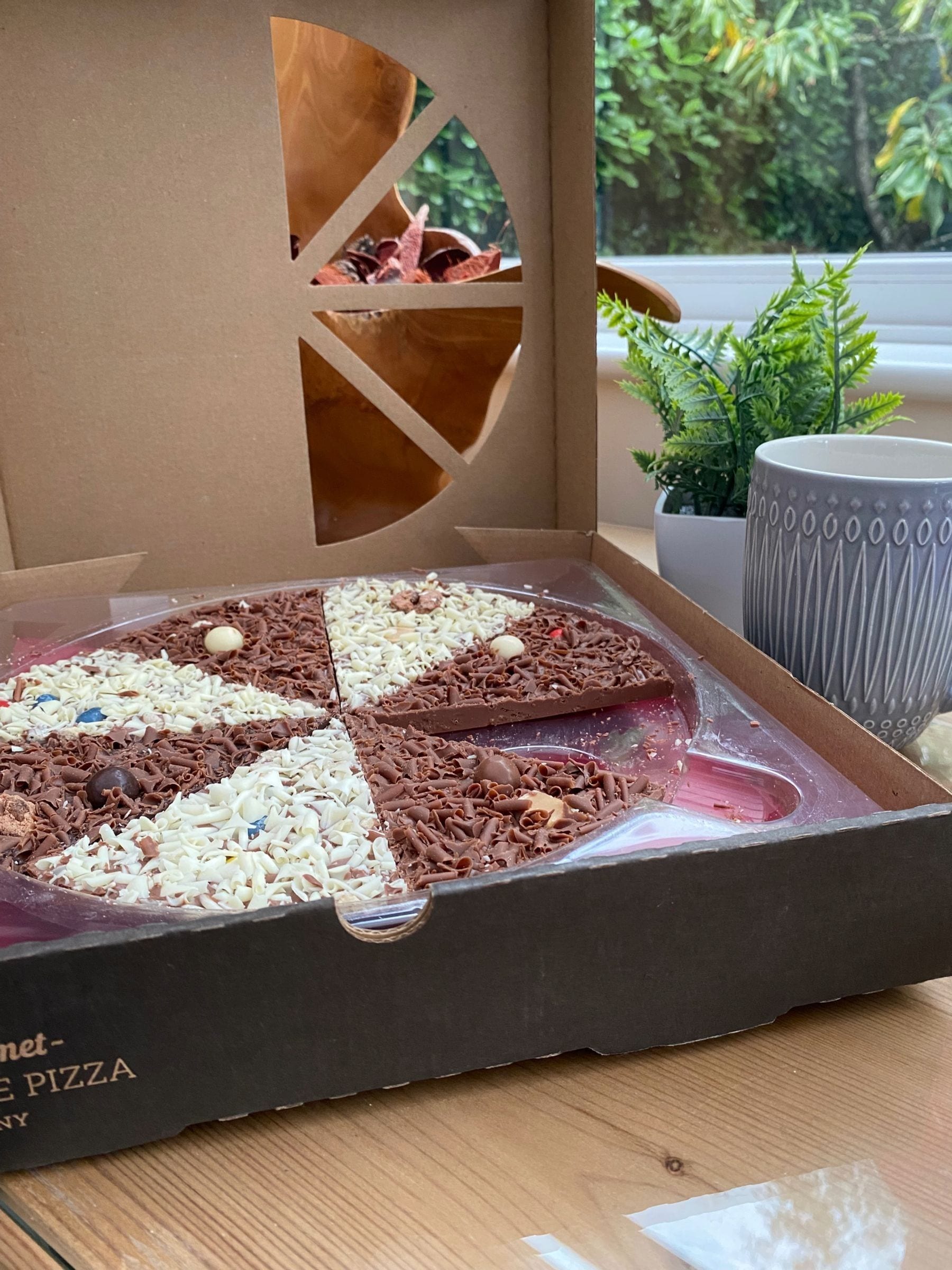 One of our top best selling chocolate pizzas, combining eight slices from six of our favourite pizzas flavours. Milk and dark Belgian chocolate with a variety of premium toppings. ranging from vanilla fudge, chocolate coated rice balls, orange chocolate and lots more - there's something here to please everyone. Cut into easy to eat slices, 2 slices each of 3 flavours and 1 each of two more. The dilemma is which to try first. Dive into this haven of Belgian chocolate and then the question is to share or not to share?