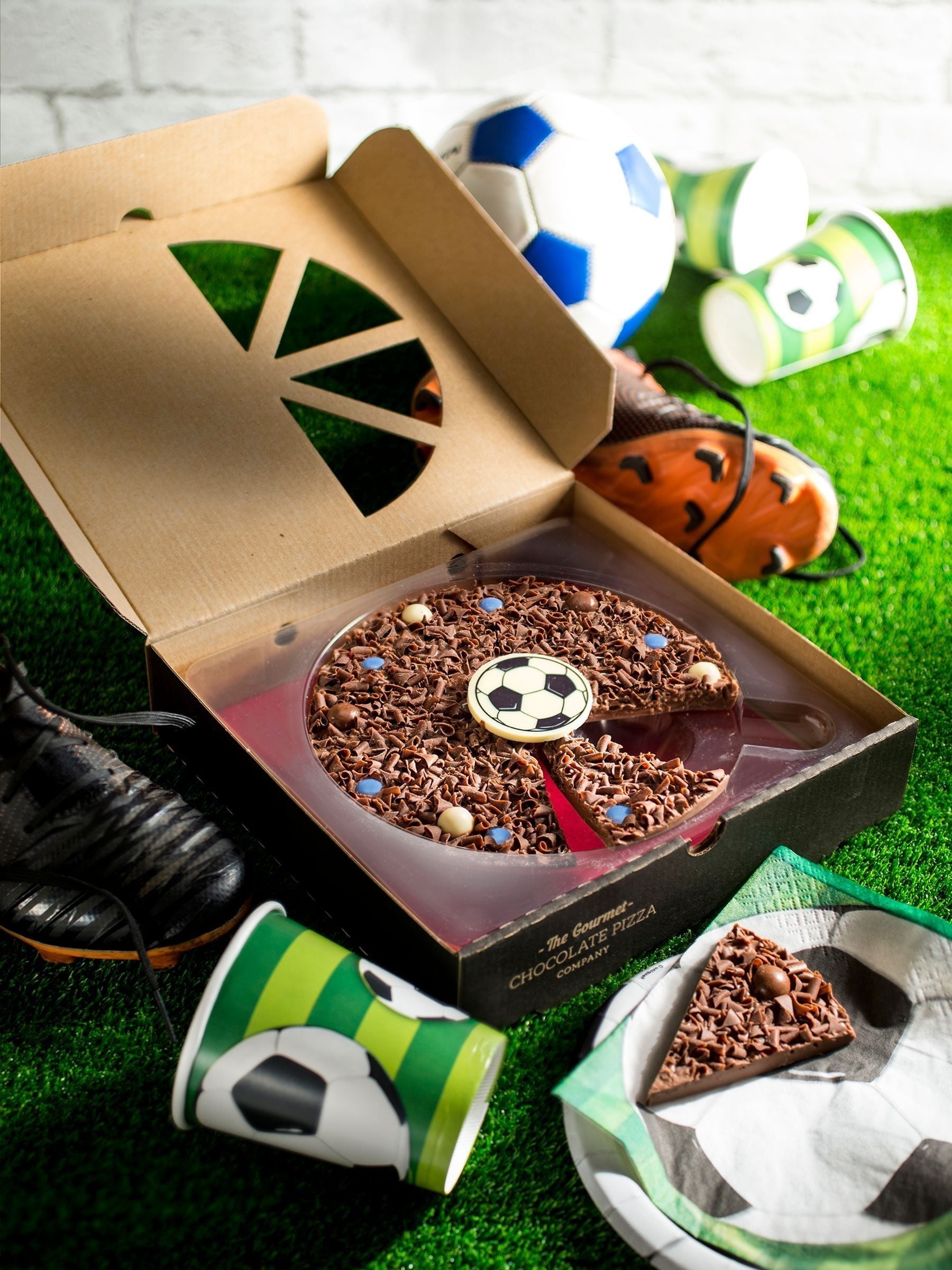 The best way to celebrate your team, or have football themed party with friends is with a football chocolate pizza! Belgian milk chocolate, topped with milk chocolate curls, red rainbow drops, milk and white chocolate coated riceballs and a white chocolate football plaque. Cut into 8 slice and ready to eat straight from the box, enjoy!
