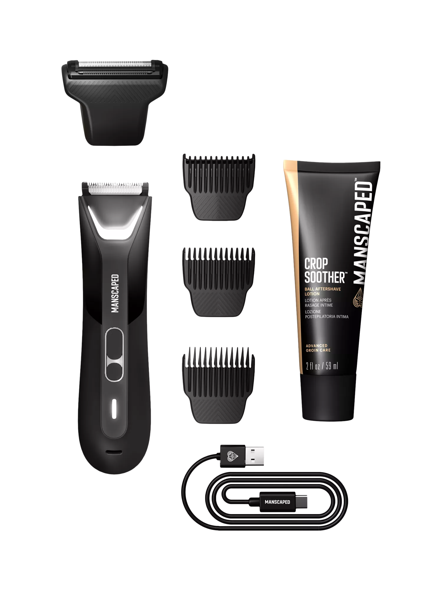 The MANSCAPED® Lawn Mower® 5.0 Ultra Essentials Kit features The Lawn Mower® 5.0 Ultra electric trimmer and Crop SootherTM after-shave lotion for the best below-the-waist shave. With an advanced dual-head system and SkinSafeTM blades, The Lawn Mower® 5.0 Ultra is a next-gen groin groomer that’ll give you the power to trim, shave, and shape to your liking. This next-level male trimmer is cordless, waterproof, and delivers constant power for a smooth shave. It also comes with interchangeable blade heads and adjustable trimming guard sizes for different hair lengths. The convenient multi-function button gives you access to a dual-temp spotlight or travel mode.