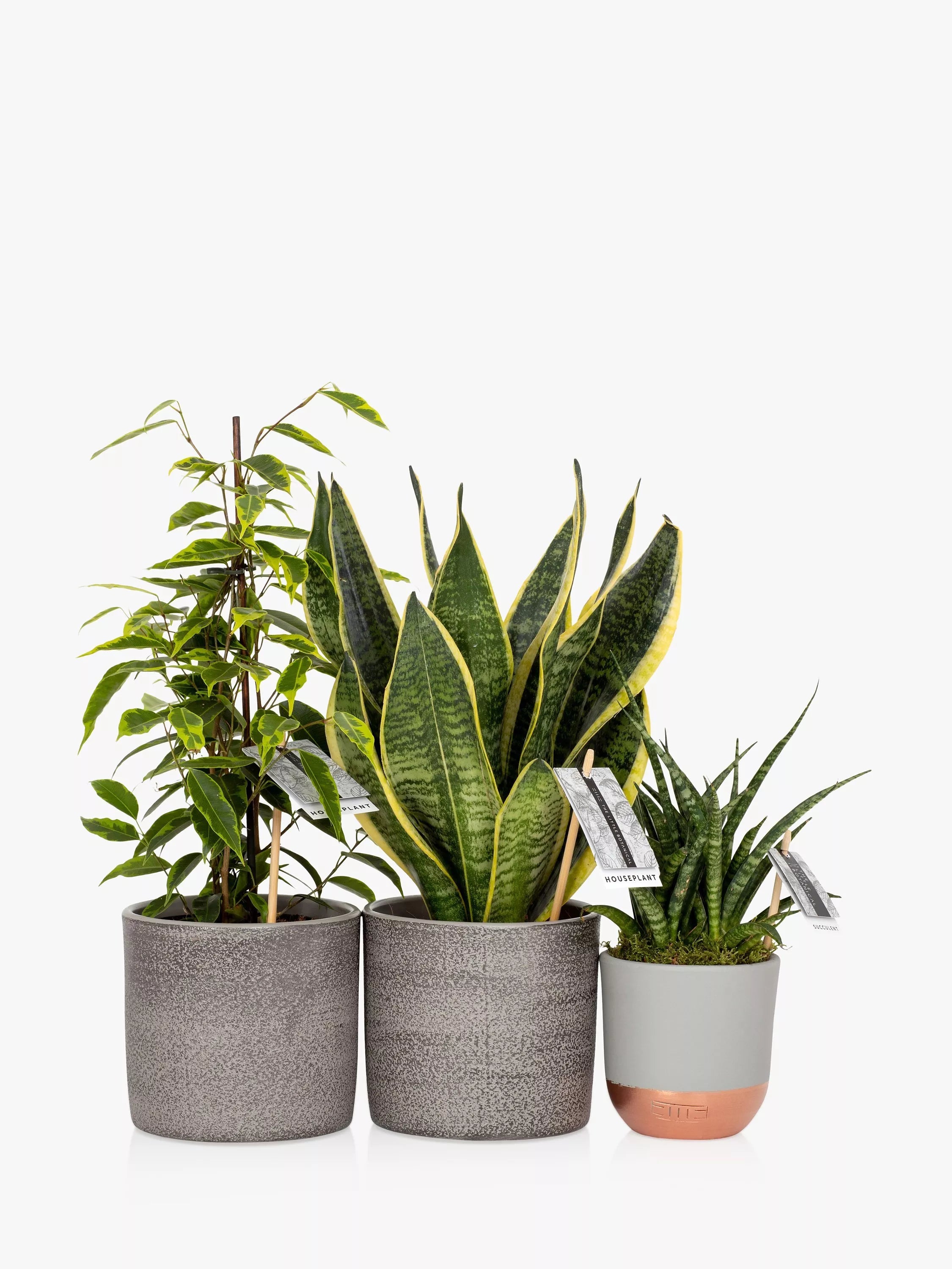 Plants included; a Sansevieria punk, a Ficus Benjamina and a Snakey Sansevieria. Potted in our stylish grey ceramics, they can instantly be added to any room to create a perfect plant gang. Both these Sansevierias work well either a well-lit or a darker corner and only need watering once a fortnight. The Ficus Benjamina needs watering once a week. The plant bundle arrives in separate boxes & will transform your home and purify the air!