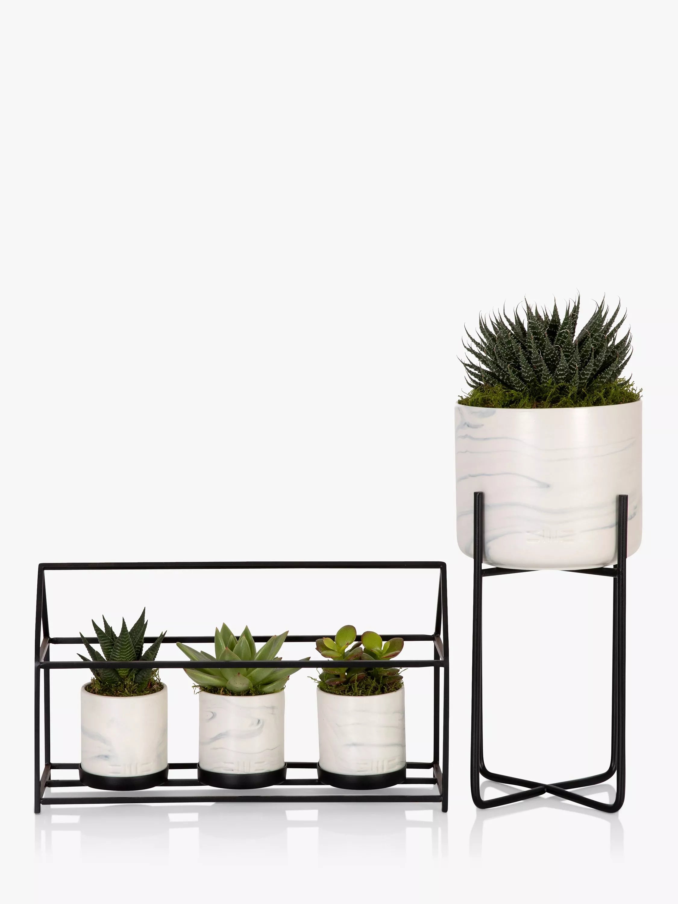 This popular group of gorgeous succulents in marble planters is an absolute must-have for your house. The marble Succulent Trio House and Succulent Plant Stand look great together and will add a real feeling of zen to your home. The Succulent Trio House includes 3 different living succulents planted in little marble pots in a black metal house. Paired with the Haworthia Succulent Planter stand, they give a real “Wow!” effect.