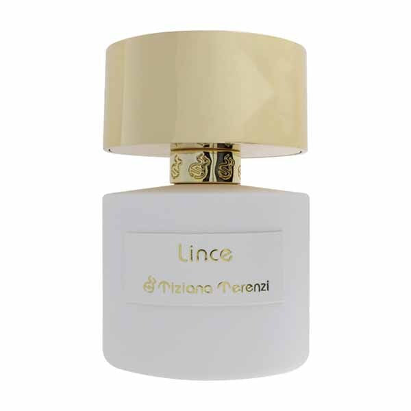Tiziana Terenzi Lince is presented as a distinguished 100ml fragrance formulation. This luxurious composition adheres to the high concentration standard of an Extrait De Parfum. The packaging features a sophisticated blend of minimalist white and polished gold accents.