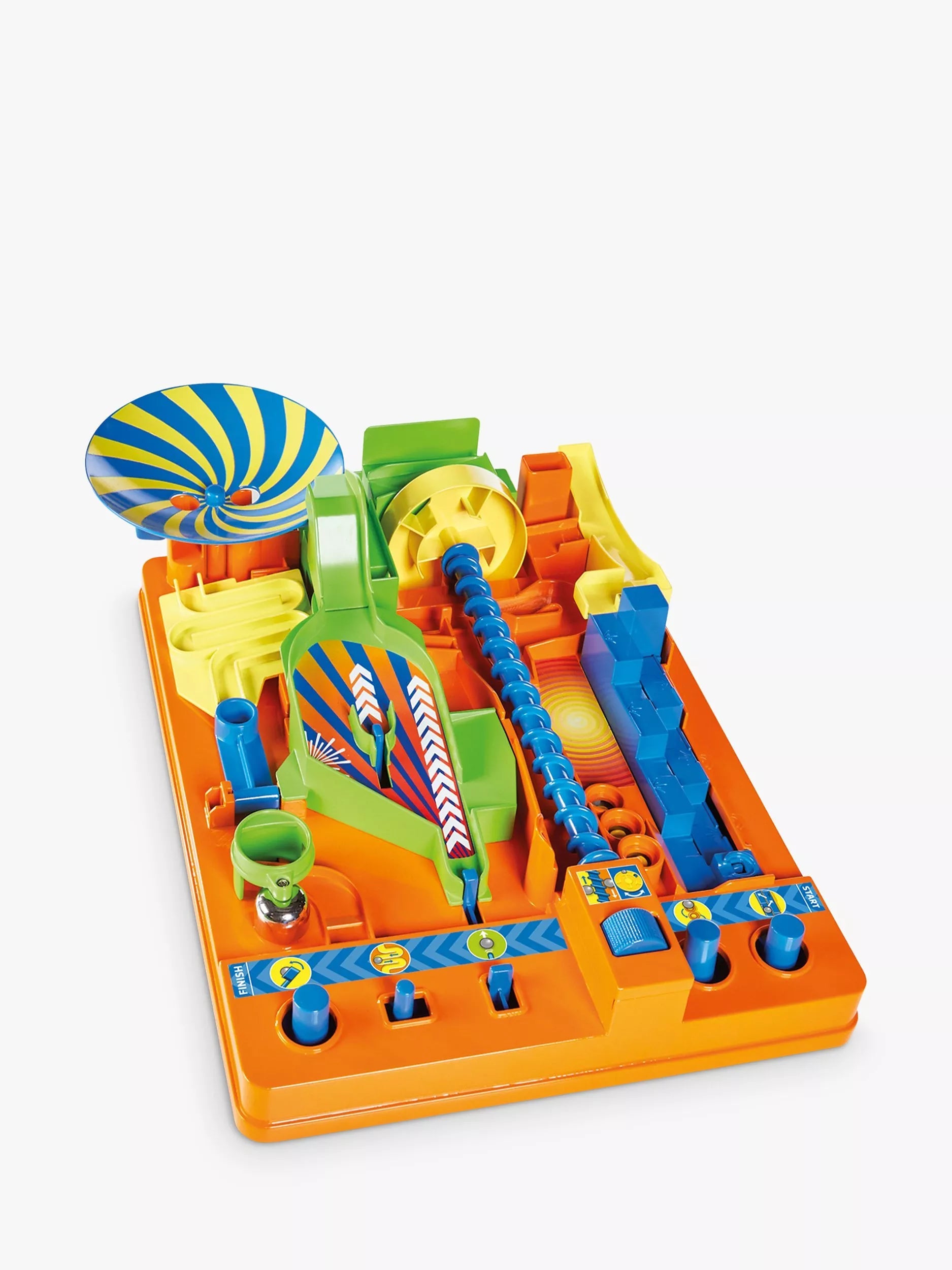 Next up, the See-saw leads to the Ferris Wheel Maze – turn it this way and that to find a way out and on to the Corkscrew. Gently twist the dial to tease the ball along – it’s like walking a tightrope! Other challenges follow – Hop/Step, Pinball, Pot Luck (watch you don’t get sent back), jiggling on the Tipping Maze and a final Catapult blast to the Finish bell!