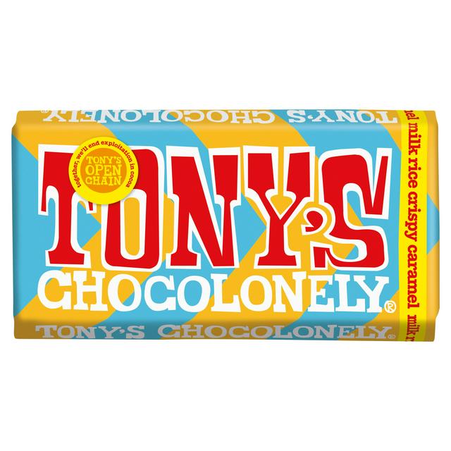This Tony's Chocolonely bar blends smooth milk chocolate with satisfying textures and flavours. It features real pieces of caramel alongside crunchy puffed rice crisps for a complex bite. The brand operates with a strong commitment to ethical cocoa sourcing, aiming to end exploitation throughout the industry.