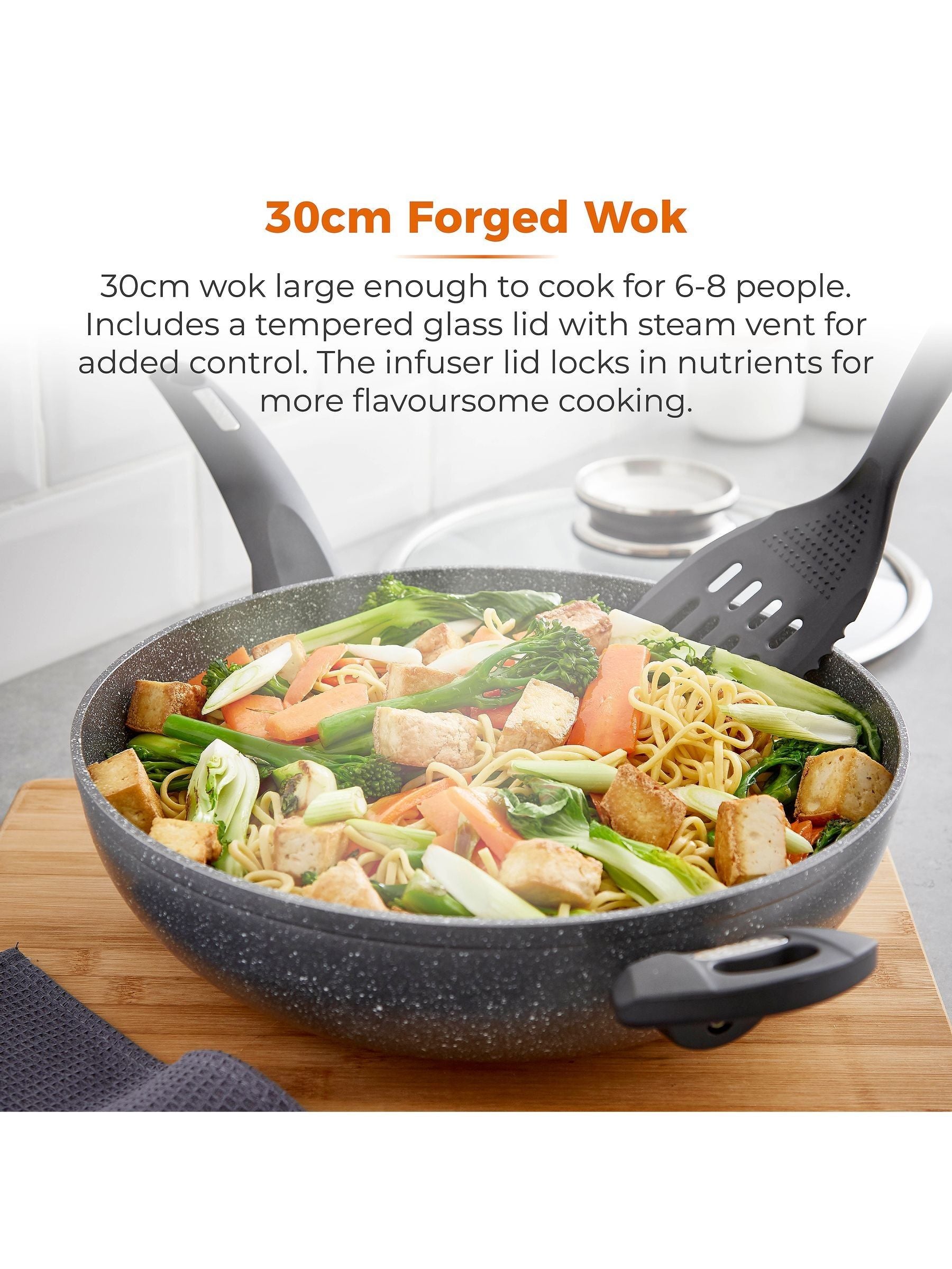 Cook deliciously sizzling fajitas and healthy stir-fry dishes with the Tower 30cm Forged Wok. Featuring high-grade non-stick technology, the Cerastone coating is 5x stronger than other non-stick coatings, and is PFAS, PFOA, PTFE, lead and cadmium-free so you can enjoy healthy meals using little or no oil. Its high quality, long-lasting forged aluminium body enables quick and easy adjustment of temperatures for more efficient cooking results, with no hot spots. The wok has a softtex handle and helper handle for comfortable control over your cooking, with an infuser lid that helps lock in and add extra flavour to your dishes.