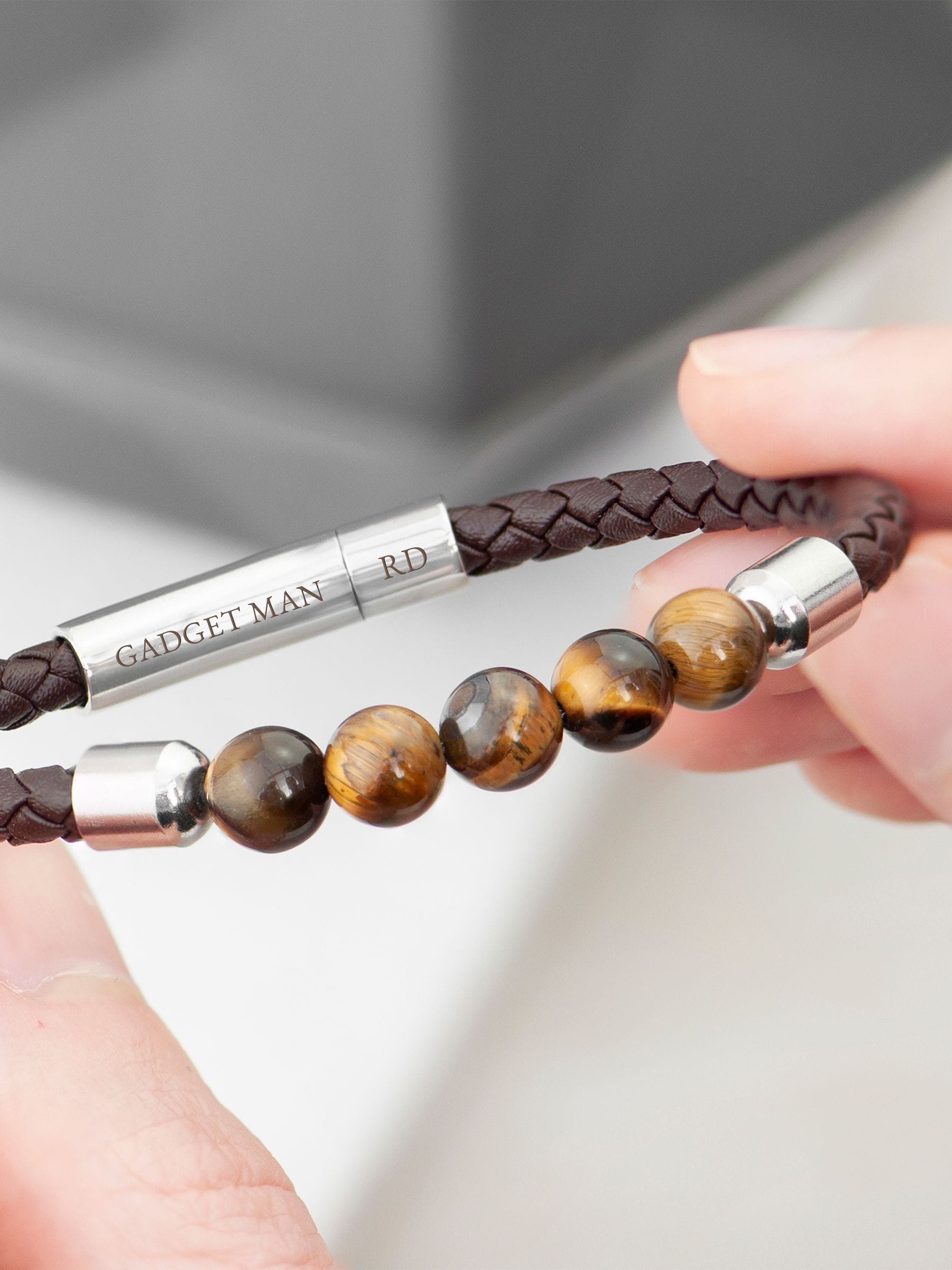 Our chic and elegant personalised men’s woven tiger’s eye bracelet is sure to be a gift that he will love and cherish. This beautiful piece of jewellery is made from woven leather with beaded tiger's eye gemstone accenting it, adding an extra bit of flair. It’s timeless quality means it will perfectly accent any outfit, be it for that special night out or for everyday use. Personalise his bracelet with his initials and a heartfelt message, making it a truly unique and special way of showing him just how much he means to you. Initials: Up to 3 characters. Message: Up to 15 characters. Length Open: 21cm Diameter. Closed: 8cm x 0.8cm x 0.8cm.