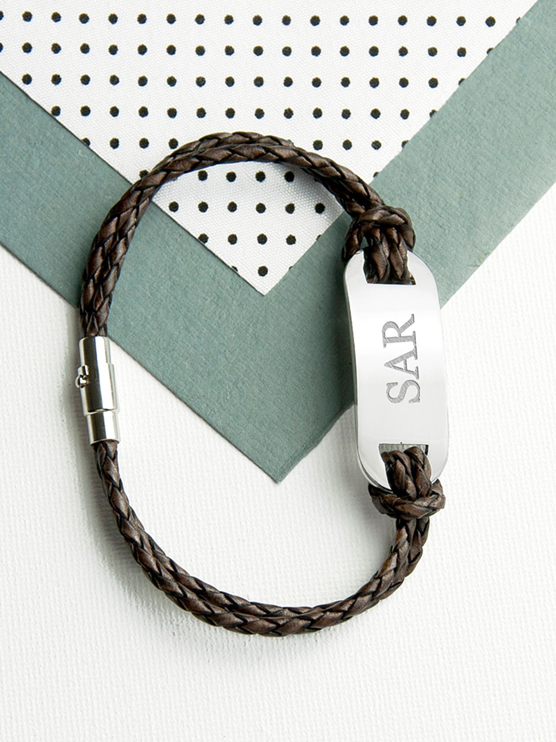 A statement men's leather bracelet, engraved with up to 30 characters. The bracelet is made from treated, hard-wearing woven leather and has a distinctive magnetic clasp for added security as well as being easy to wear.