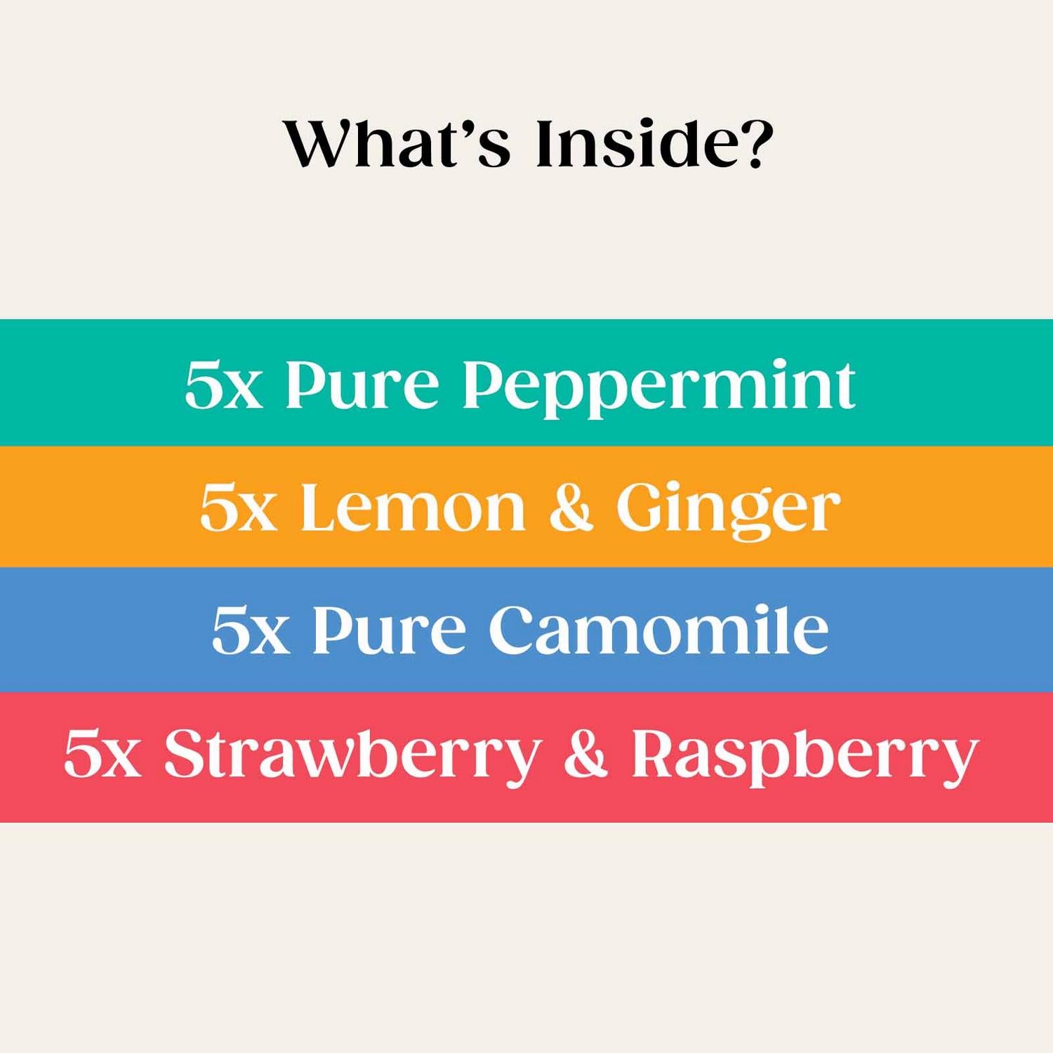 A selection of herbal infusions. This vibrant selection box brings together four timeless favourites from our classic range. Each blend is naturally caffeine-free and full of flavour—perfect for any time of day. Whether you're craving something refreshing, comforting or delicate, there's a delicious infusion here to suit your mood.