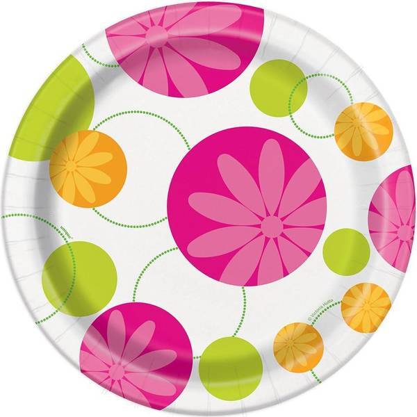 Prepare your table setting for any summer gathering with this convenient pack of eight dinner plates from Unique Party. These 9-inch circular plates are crafted from paper, making them an ideal disposable solution for serving meals during parties or seasonal events. The design features a distinctive printed circle flower pattern, adding a touch of themed decoration to your service ware arrangement.