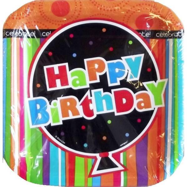These Unique Party plates come in a convenient pack of 10, ready for any celebration. They are constructed from durable paper material, making cleanup straightforward after your event concludes. Measuring 7 inches in width, these attractive striped birthday plates offer adequate space for party servings. The design incorporates a visually engaging mix of patterns suitable for festive occasions.