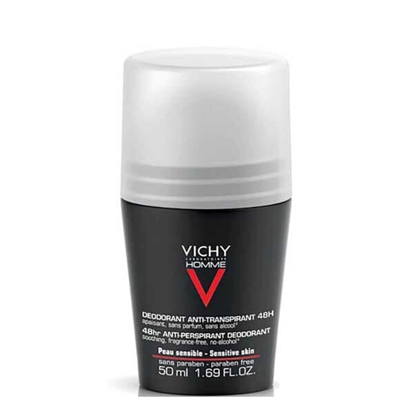 the vichy homme 48hr antiperspirant is designed for men with sensitive skin looking for longlasting deodorant and antiperspirant efficacy the zero white marks formula soothes skin from discomfort and provides odour protection for up to 48 hours fresh and soft on application no white marks left on the skin longlasting antiperspirant efficac 48hour deodorant fresh and soft on application