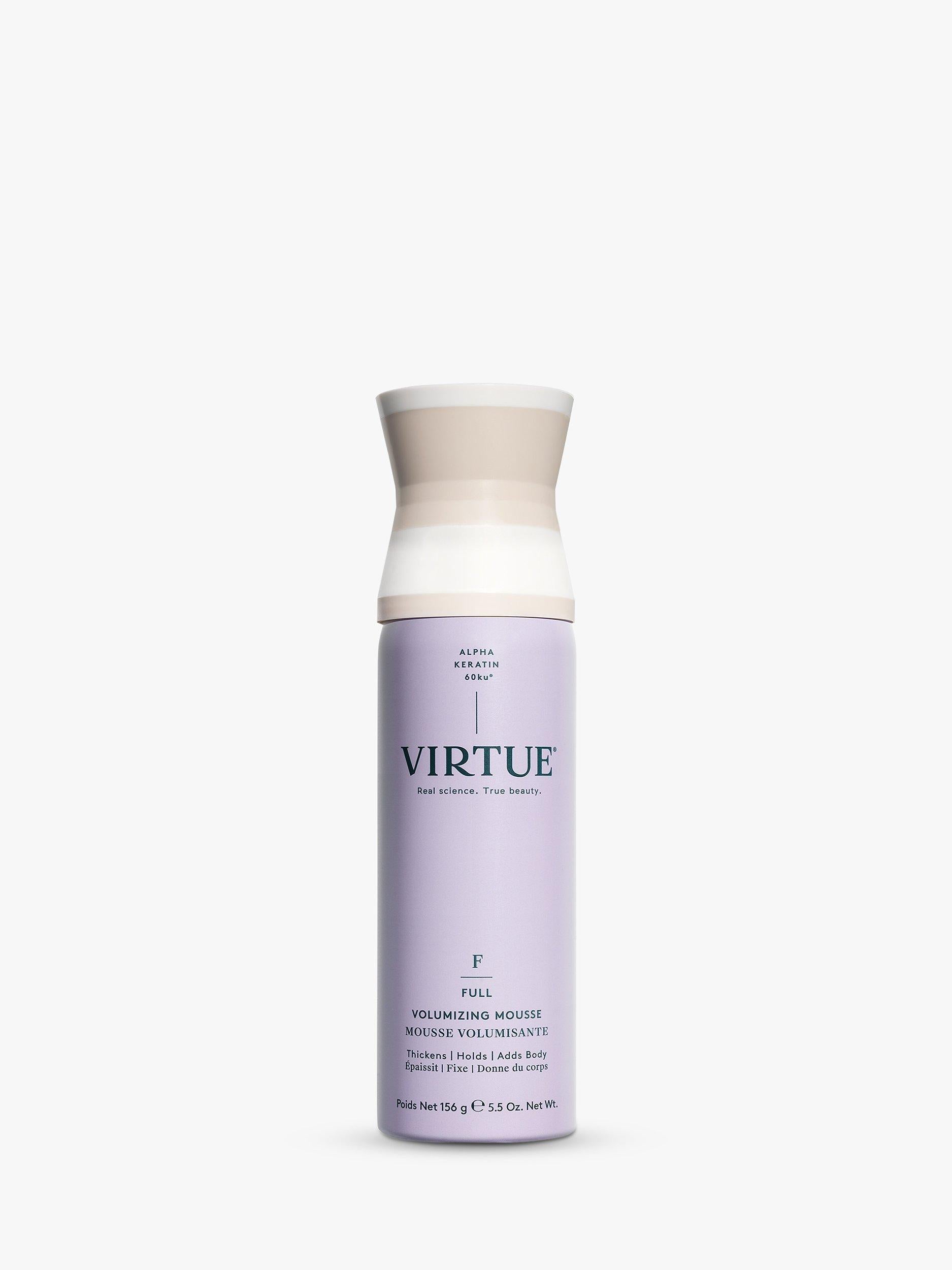 Virtue® Volumizing Mousse instantly thickens hair, adds body, bounce, and flexible hold for a long-lasting style.