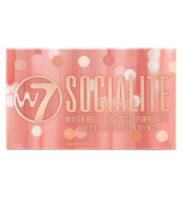 The W7 Socialite palette is an indulgent, multi-textured pressed pigment collection designed for creating sophisticated makeup looks. This 8.5g palette features high-pigment formulas that allow for versatile application and buildable colour payoff. The packaging suggests a range of warm, rosy, and golden shades ready for any social engagement.