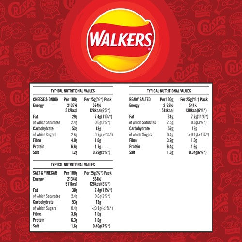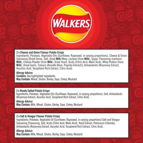 • Includes six bags: 2 Ready Salted, 2 Cheese & Onion, and 2 Salt & Vinegar.