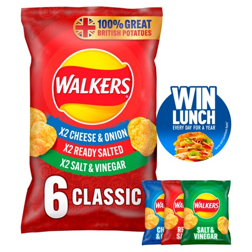This Walkers Classic Variety Multipack offers six individual bags of popular salted crisps selections. These satisfying snacks are carefully crafted using 100% Great British Potatoes for reliable quality. They are convenient for packed lunches or when you need an on-the-go savoury treat.