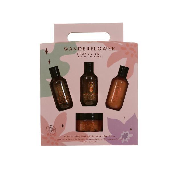 4 essential body care items for travel Includes scrub, wash, lotion and oil Scented with pear and neroli notes All bottles are 100ml – flight-safe Comes in a beautifully boxed set Whether you're heading off on holiday or enjoying a weekend away, the Wanderflower Travel Essentials Set is the perfect companion for your journey. This beautifully presented 4-piece collection features everything you need to feel refreshed and nourished on the go. With a light pear and neroli fragrance, each product offers a subtle burst of uplifting scent while caring for your skin. The set includes a gentle body scrub to exfoliate, a creamy body wash to cleanse, a softening lotion to moisturise, and a lightweight body oil to seal in hydration and leave a healthy glow. All four items come in travel-friendly 100ml sizes, ideal for hand luggage or short breaks.