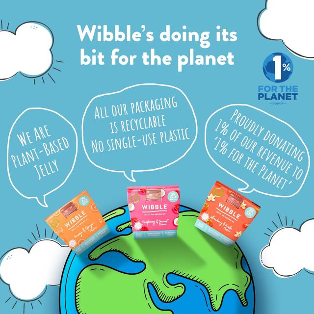 Plant-based jelly pots made with real Raspberry juice. Each jelly pot contains pressed juices from 14 raspberries. It's made from and tastes like REAL fruit.All our jelly pots are not only tasty but low in sugar and only 44 calories per pot, with nothing artificial. 100% NATURAL jelly bursting with REAL fruit juices. Thatâs the Wibble way! Wibble also donates 1% of it's revenue to charities focused on environmental causes and all our packaging is recyclable.Â