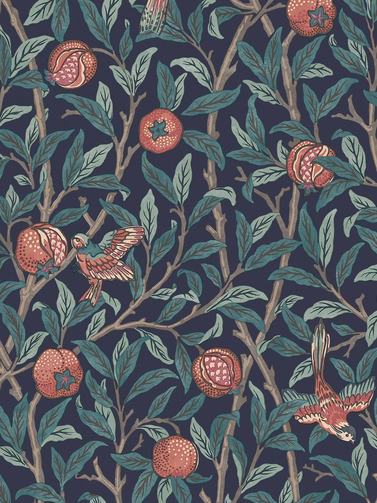 The inspiration for this piece was William Morris's much earlier pattern, "Fruit", which similarly depicts luscious pomegranates amongst branches, leaves and blooming pomegranate flowers. With nature the focus, this vibrant and whimsical design is a fine exemplar of Morris characteristic style.