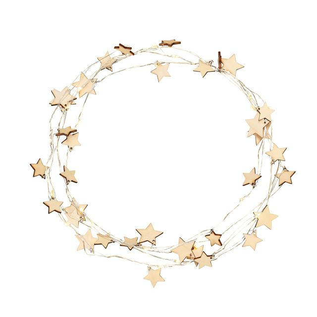 These wooden star wire lights provide a warm, seasonal glow perfect for enhancing festive decorations. Easily wrap these lights around candles, vases, or other favourite seasonal items to create a charming display. The set includes 20 warm white LED bulbs fixed to a flexible silver wire.
