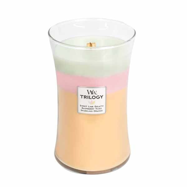 Experience the layered fragrance journey of the WoodWick Large Trilogy Summer Sweets Candle.