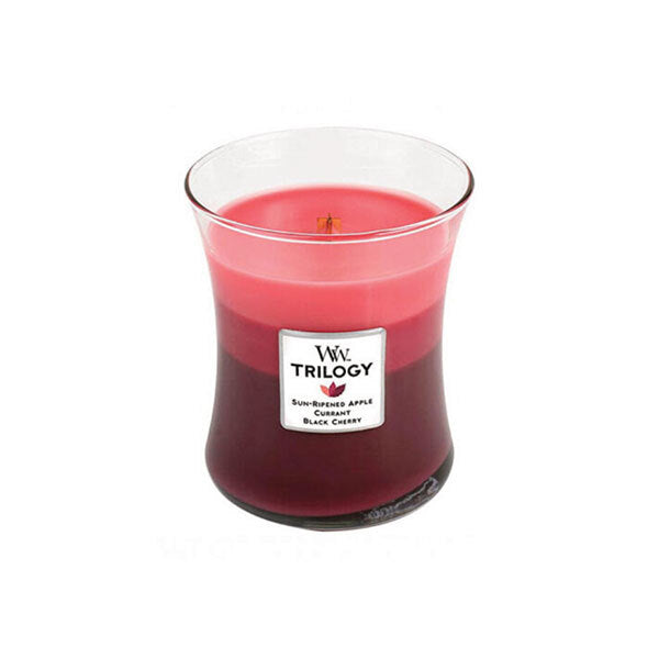 This WoodWick Trilogy candle combines three distinct summer fruit fragrances into one decorative piece. The layered wax design releases a complex aroma as it burns, enhancing your home atmosphere. It offers a sophisticated sensory experience derived from apple, currant, and black cherry notes.
