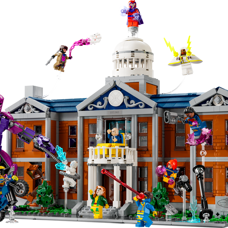 The 2-level 3,093-piece X-Men X-Mansion measures over 40 cm (16 in.) wide and features a buildable Sentinel figure and 10 X-Men minifigures: Professor X, Wolverine, Jean Grey, Cyclops, Storm, Gambit, Rogue, Iceman, Bishop and Magneto. The upper level houses Professor X's laboratory, Wolverine’s bedroom and a medical lab. On the ground level is a lobby, classroom and a library. On the left of the X-Mansion is the Danger Room training facility, which is accessed via a sliding door and can be customised by reconfiguring walls and accessories. Interactive features include a sliding interactive whiteboard and a rooftop that can be destroyed by activating a switch.